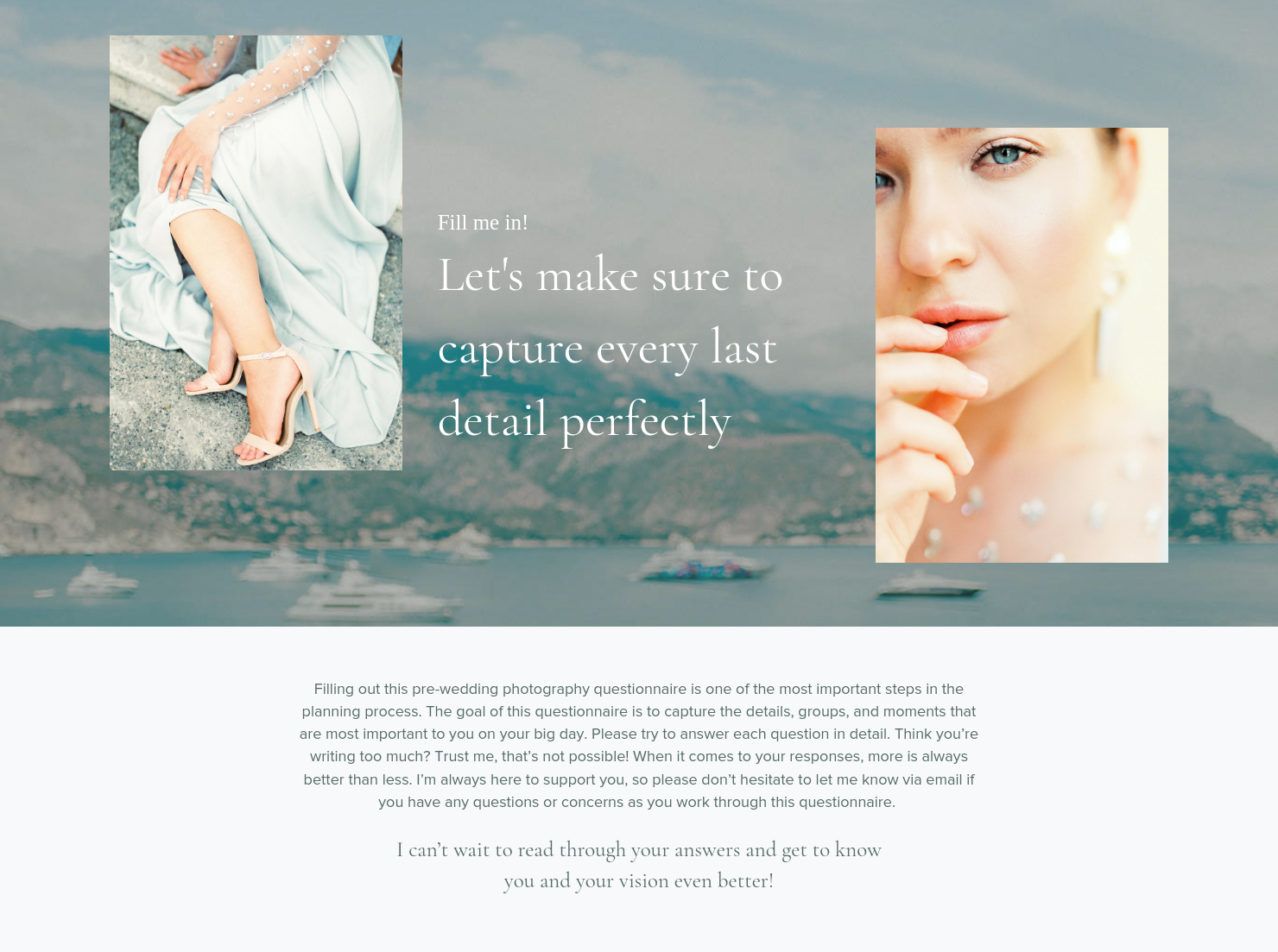 Send this detailed questionnaire to your clients post-booking to ensure you gather all the information needed to perfectly capture their big day. It covers essential details and preferences, helping you prepare thoroughly and deliver a memorable experience.