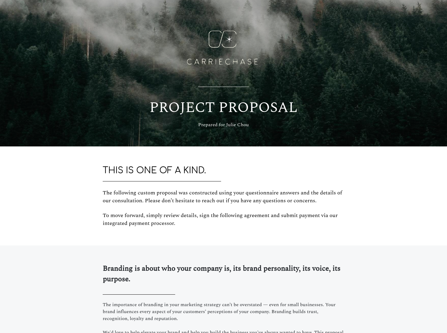 Book your client, get an initial payment, and kick off your project all in one experience. This proposal includes service details, a questionnaire, invoicing, and eSigning capabilities for a straightforward workflow that sets clear project expectations with clients.